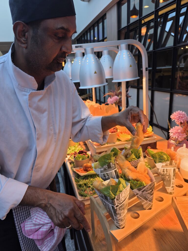 The amazing chef delivered once again, and the food was laid out ready for our ‘street food feast’. Well, we were spoilt for choice with a huge selection of gyoza’s, chips, burgers, pizza, fish, curry, rice and a build your own salad bar.